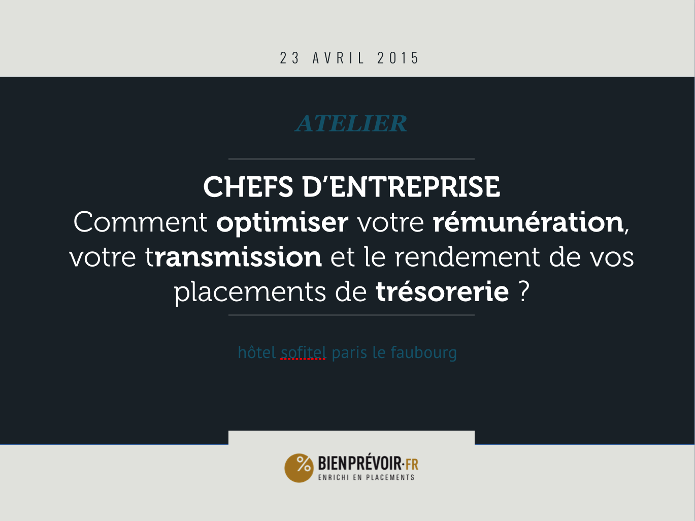 Téléchargez le document de présentation de notre conférence-atelier qui s'est tenue le 23 avril 2015 à Paris, à propos du Patrimoine du Chef d'Entreprise et des solutions pour optimiser sa Rémunération, Transmission, Trésorerie.