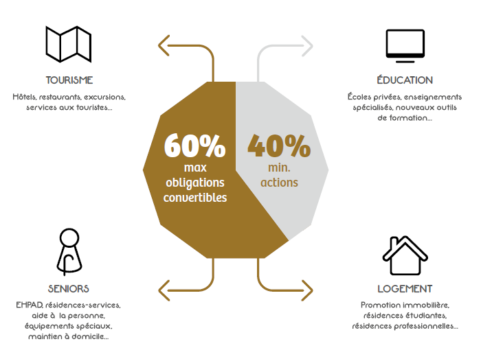 Secteurs d'investissement : sociétés / PME de "rendement" situées dans les secteurs : le tourisme, l’éducation, le logement, le marché des seniors et ayant une capacité à générer des revenus avec une certaine visibilité