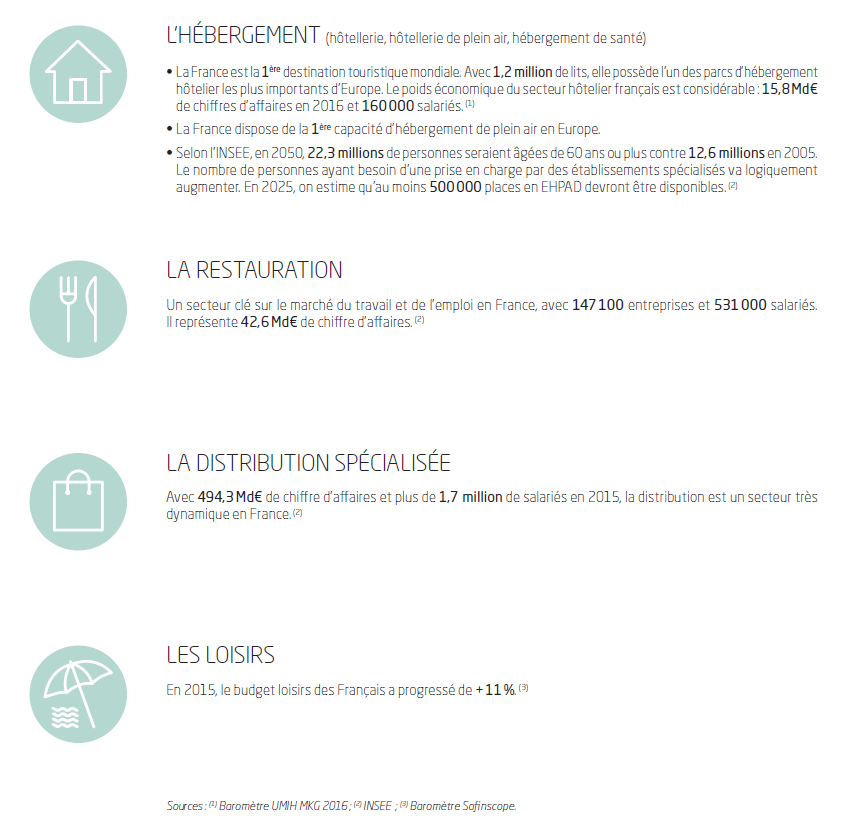 Ce Fonds ciblera en particulier les secteurs de l’hébergement (hôtellerie, hôtellerie de plein air, hébergement de santé), de la restauration, de la distribution spécialisée et des loisirs.