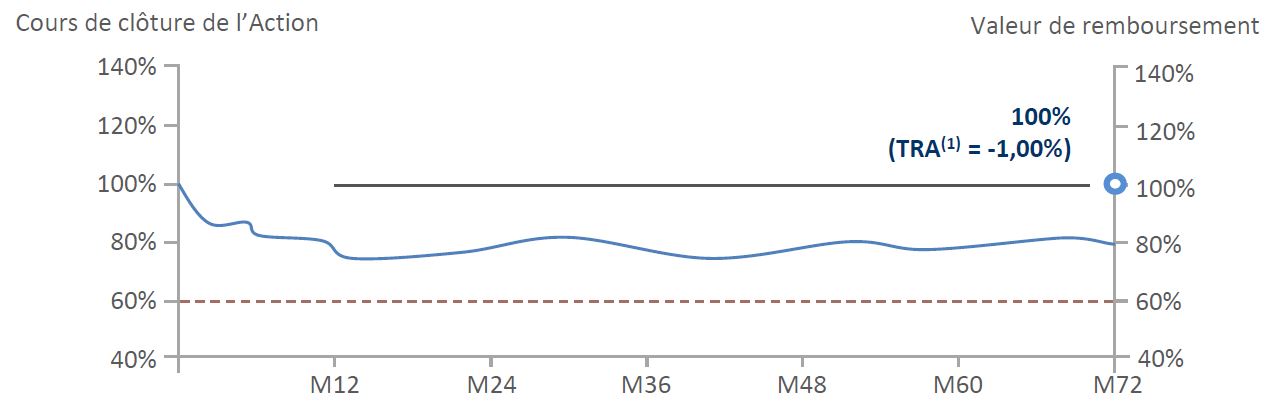 À l’échéance des 72 mois, à la date de constatation finale (le 17 mai 2027), la performance de l’Action est strictement négative mais supérieure ou égale à 40 depuis la date de constatation initiale (le 17 mai 2021) (soit une baisse de 20% dans cet exemple) et se situe donc au dessus du seuil de perte en capital de 60% (inclus). L’investisseur reçoit alors l’intégralité du capital initial. Le Taux de Rendement Annuel Net (2) est alors de -1,00% contre un Taux de Rendement Annuel Net de -4,60% pour un investissement direct dans l’Action.