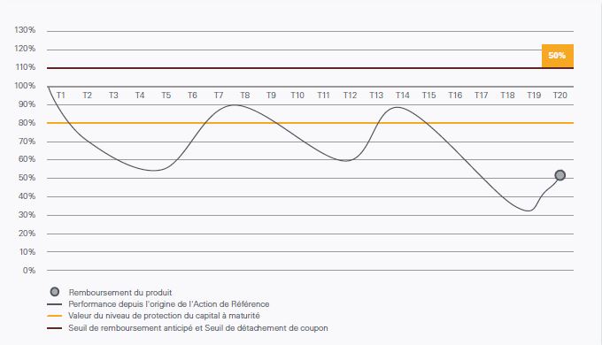 Aux dates de constatations trimestrielles 4 à 20 (T4 à T20 dans le graphique ci-dessous), le cours de l’Action de Référence clôture en-dessous du seuil de remboursement anticipé.