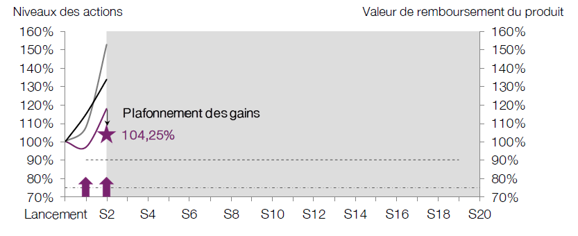 À la deuxième date de constatation semestrielle, le niveau de l’action la moins performante est supérieur ou égal à 75% de son niveau observé à la date de constatation initiale. L’investisseur reçoit(1) alors un coupon de 4,25% à l’issue de ce semestre .