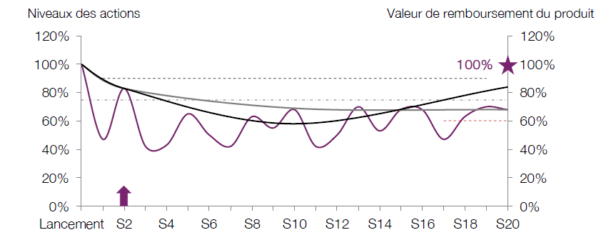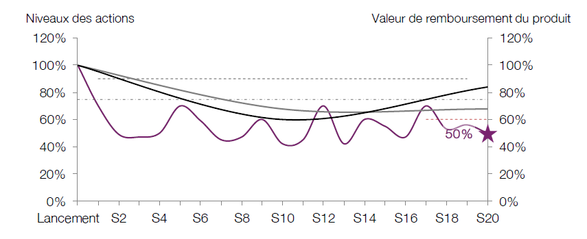 À chaque date de constatation semestrielle, du semestre 1 au semestre 19, le niveau de l’action la moins performante est inférieur à 75% de son niveau observé à la date de constatation initiale. Aucun coupon n’est alors versé à l’issue de ces semestres et le mécanisme de remboursement anticipé n’est pas activé.