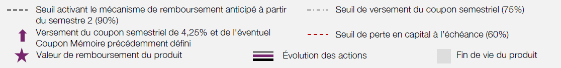 Un mécanisme de « Coupon Mémoire » : Si, à l’une des dates de constatation semestrielle, le niveau de l’action la moins performante est supérieur ou égal à 75% de son niveau observé à la date de constatation initiale, l’investisseur bénéficie de la possibilité de récupérer les coupons semestriels de 3,75%(1)net éventuellement non versés précédemment.