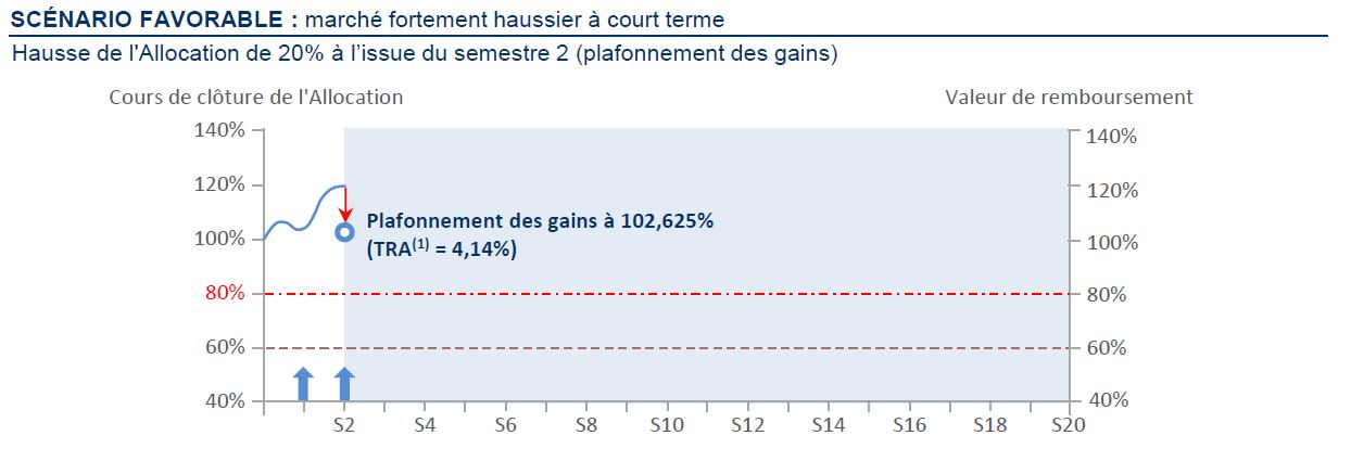 L’investisseur reçoit(1) alors l’intégralité du capital initial majorée du coupon semestriel conditionnel au titre de ce semestre, soit 102,625% du capital initial, ce qui représente un gain de 2,625% contre 20% pour un investissement direct dans l’Allocation. Le Taux de Rendement Annuel Net(2) est alors égal à 4,14%, contre un Taux de Rendement Annuel Net de 18,28% pour un investissement direct dans l’Allocation, du fait du mécanisme de plafonnement des gains.